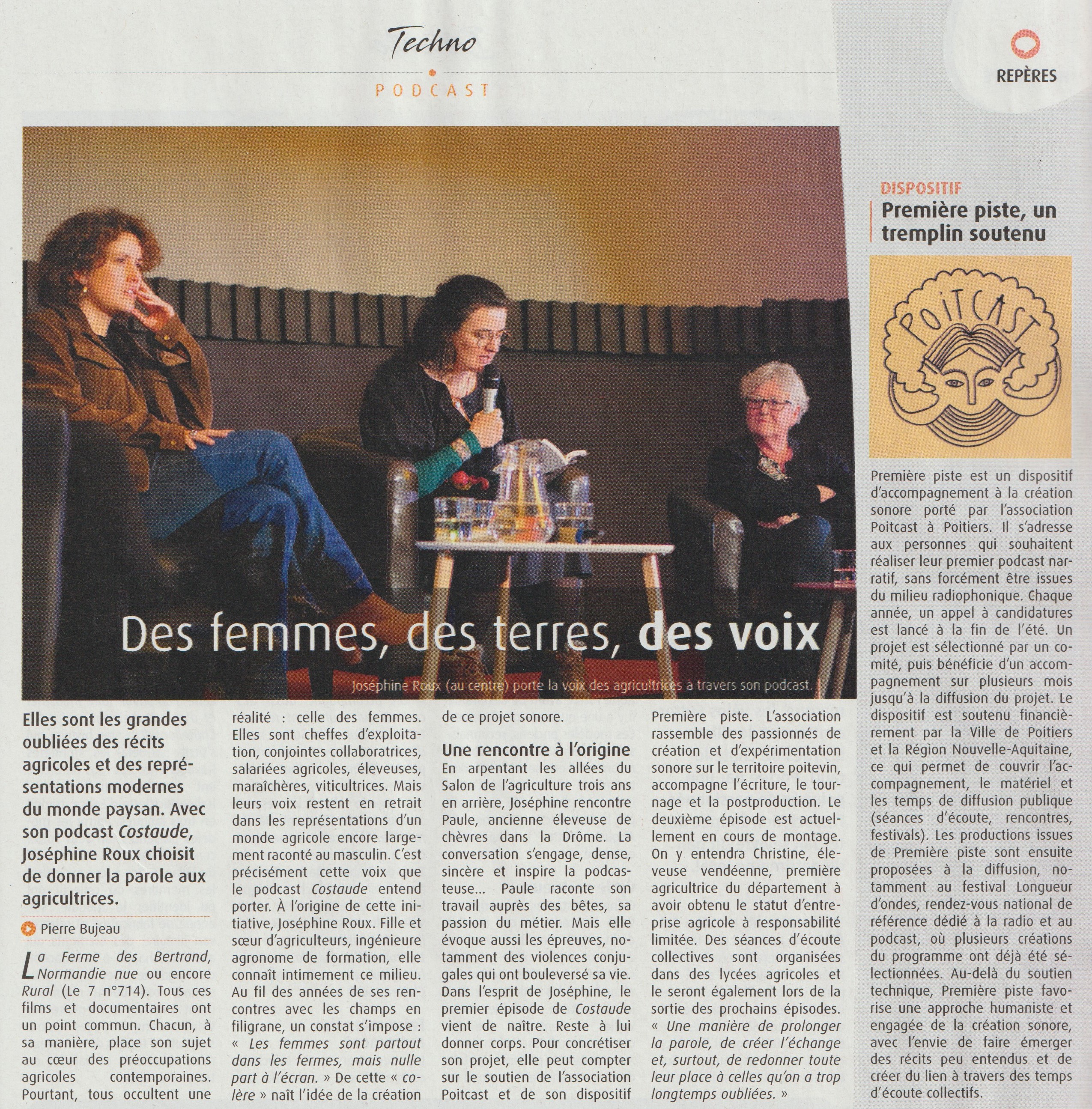Première Piste est un dispositif d'accompagnement personnalisé proposé par Poitcast depuis 2023 pour la création d'un podcast original. Sélectionné.e sur candidature après un appel à projet diffusé l'été, le.la lauréat.e du dispositif est accompagné.e pendant un an par des professionnels du son dans toutes les étapes de la création sonore: écriture, tournage, montage, mixage (post-production) et diffusion.